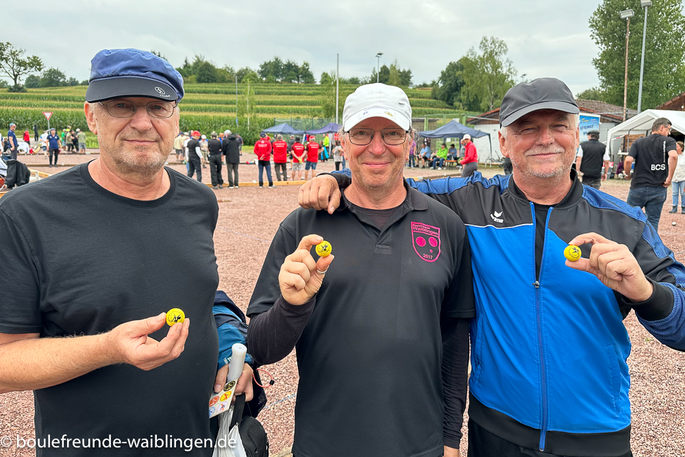 16.08.2025 Zur Landesmeisterschaft Triplette 55+ kamen über 80 Teams nach Ettenheim. Nach dem ersten Spiel teilt sich da Feld in A und C-Turnier. Das zweite Spiel entscheidet ob man weiter im A oder C-Turnier spielt oder ins B-Turnier rutscht. Das Team aus Heiko, Sylvia und Niket schafften es bis ins Halbfinale B-Turnier. Am nächsten Tag qualifizierten die drei sich zur Deutschen Meisterschaft nach Berlin.