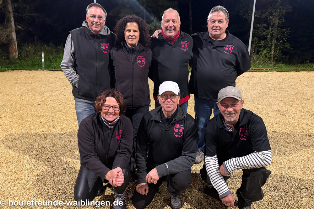 04.10.2025 Die sieben Waiblinger Spieler der ersten Mannschaft trafen sich in Welzheim um die nächste Runde auszuspielen. Nach den 6 Tetes war der Punktestand 6:6. Nach den drei Doubletten stand es 12:9. Jetzt mussste noch eins der beiden Triopletten gewonnen werden. Nach einem deutlichen Sieg der ersten Triplette war die Begegnung gewonnen und endete 17:14 für Waiblingen und stehen jetzt im 1/4 Finale.