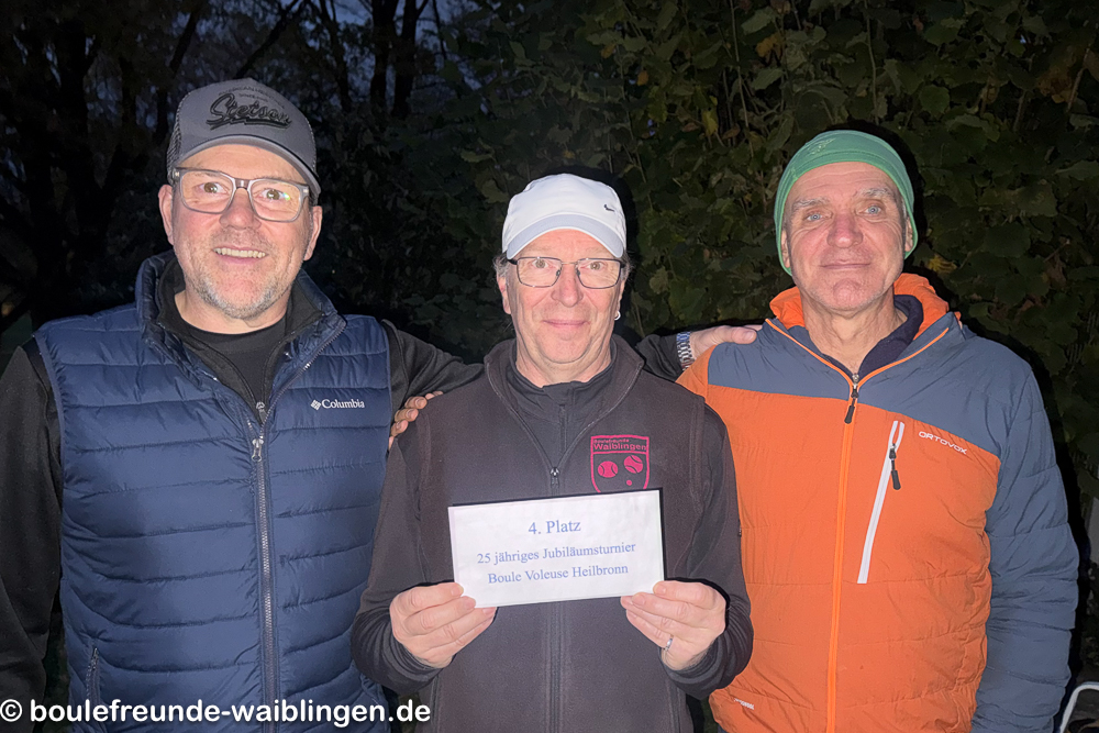 23.11.2024 Zum 32.Turnier in der Reithalle in Freckenhorst (NRW) fuhren die vier Boulespieler, Peter Loichen, Gerhard Bandel, Bela Mössinger und Peter Jäckel zum längsten Turnier in Deutschland. Es werden 6 Vorrundenspiele auf Zeit gespielt um dann im A, B, C oder D mit jeweils 12 Teams, jeder gegen jeden den Sieger auszuspielen. Nach genau 24 Stunden, es treten immer drei gegen drei Spieler an, während der vierte eine Runde pausiert, gelang es den vier Spieler unter 48 Teams den dritten Platz im A-Turnier zu belegen.